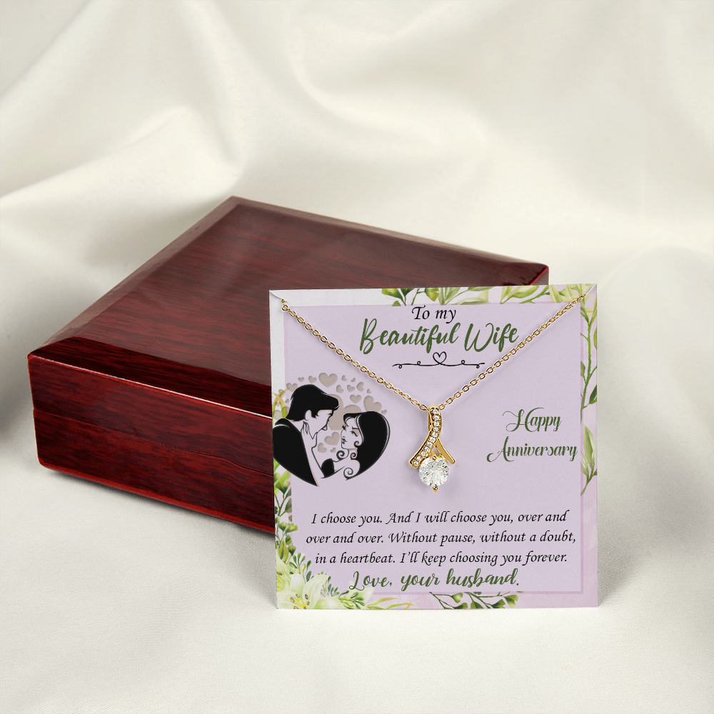 019 To My Beautiful Wife, Happy Anniversary - 18K Yellow Gold Finish Alluring Beauty Necklace With Mahogany Style Luxury Box