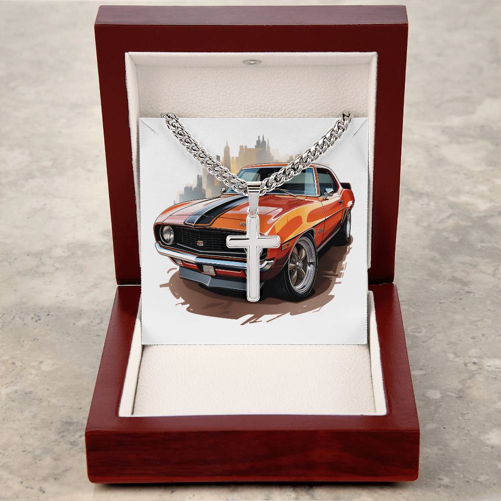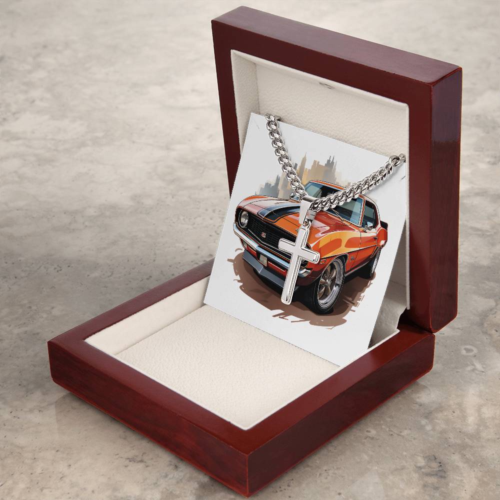 Muscle Car 08 - Stainless Steel Cuban Link Chain Cross Necklace With Mahogany Style Luxury Box